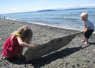 Eventually the armada all found their way to their respective docks and the waters of Elliot Bay were largely vacant. The kids turned their interest to their immediate surroundings. With great effort they set this piece of wood afloat.