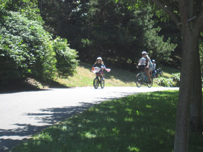 The kids were having a hard time staying awake on the back of the Big Dummy so we took a quick detour through the South Lake Union Spray Park. The unexpected dousing with cold water brought a few tears and screams but it woke everyone up. Back on the familiar soil of north Seattle we rode the Burke Gilman Trail past the other end of Lake Union...